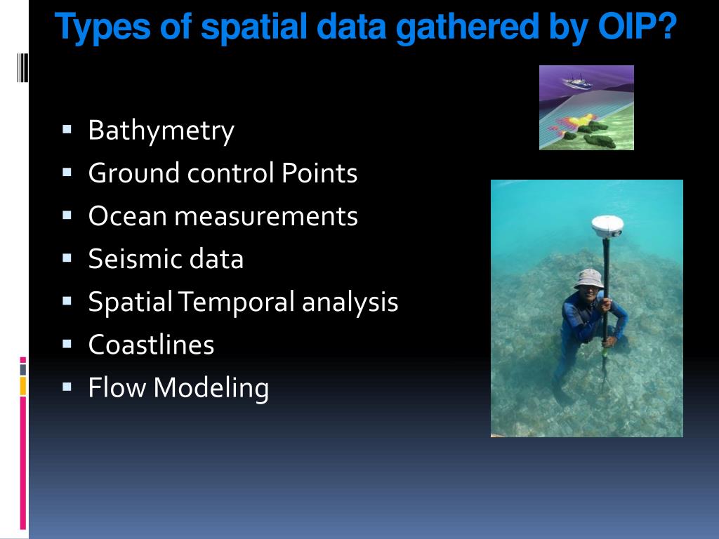 Types of spatial data gathered by OIP? • Bathymetry • Ground control Points • Ocean measurements • Seismic data • Spatial Temporal analysis • Coastlines • Flow Modeling