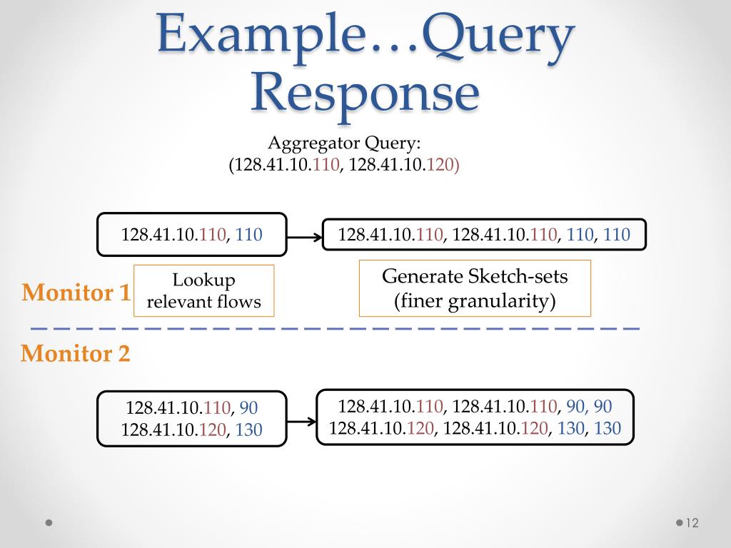 Example…Query Response Aggregator Query: (128.41.10.110, 128.41.10.120) 128.41.10.110, 110 128.41.10.110, 128.41.10.110, 110, 110 Generate Sketch-sets (finer granularity) Lookup relevant flows Monitor 1 Monitor 2 128.41.10.110, 128.41.10.110, 90,90 128.41.10.120, 128.41.10.120, 130, 130 128.41.10.110, 90 128.41.10.120, 130