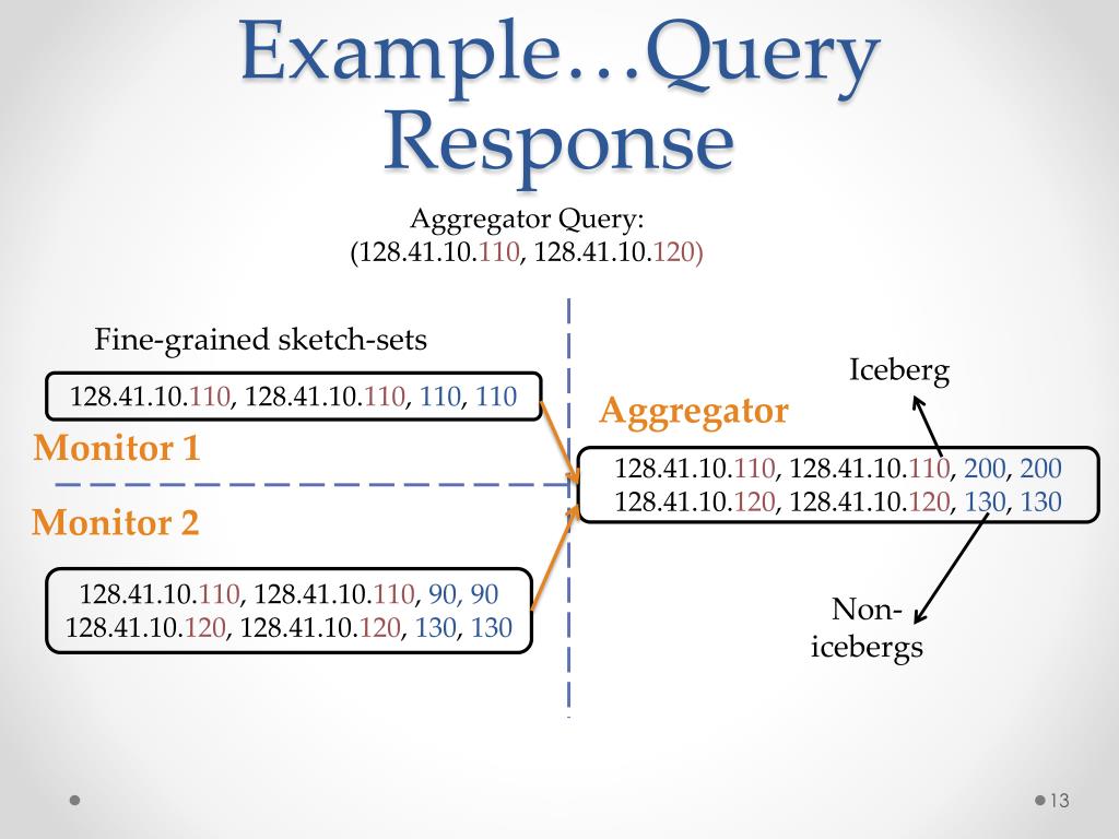 Example…Query Response Aggregator Query: (128.41.10.110, 128.41.10.120) Fine-grained sketch-sets Iceberg 128.41.10.110, 128.41.10.110, 110, 110 Aggregator Monitor 1 128.41.10.110, 128.41.10.110, 200, 200 128.41.10.120, 128.41.10.120, 130, 130 Monitor 2 128.41.10.110, 128.41.10.110, 90,90 128.41.10.120, 128.41.10.120, 130, 130 Non-icebergs