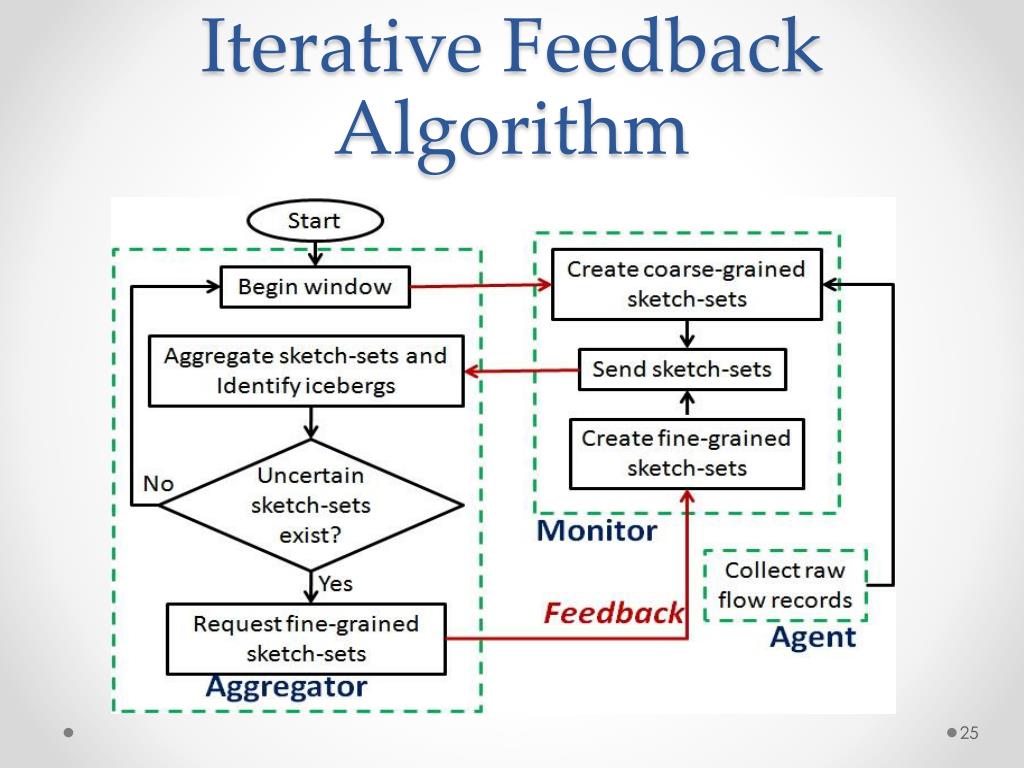 Example INTERSECTION SUBTRACTION Coarse-grained Sketch-sets Disjoint Sketch-sets Non-icebergs (startIP, endIP, minPkt, maxPkt) Aggregator 128.41.10.10, 128.41.10.50, 15, 30 128.41.10.110, 128.41.10.150, 100, 110 128.41.10.210, 128.41.10.210, 300, 300 128.41.10.10, 128.41.10.34, 15, 30 128.41.10.35, 128.41.10.50, 10, 65 128.41.10.51 , 128.41.10.70, 10, 35 128.41.10.100, 128.41.10.109, 90, 130 128.41.10.121, 128.41.120.150, 100, 110 128.41.10.110, 128.41.10.120, 90, 240 128.41.10.210, 128.41.10.210, 300, 300 Monitor 1 Monitor 2 128.41.10.35, 128.41.10.70, 10, 35 128.41.10.100, 128.41.10.120, 90, 130 Query monitors (uncertain) Iceberg