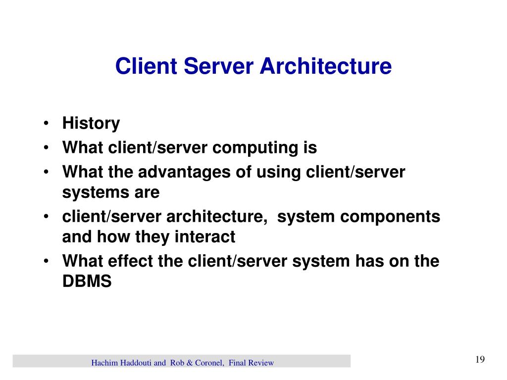 Client Server Architecture • History • What client/server computing is • What the advantages of using client/server systems are • client/server architecture, system components and how they interact • What effect the client/server system has on the DBMS Hachim Haddouti and Rob & Coronel, Final Review