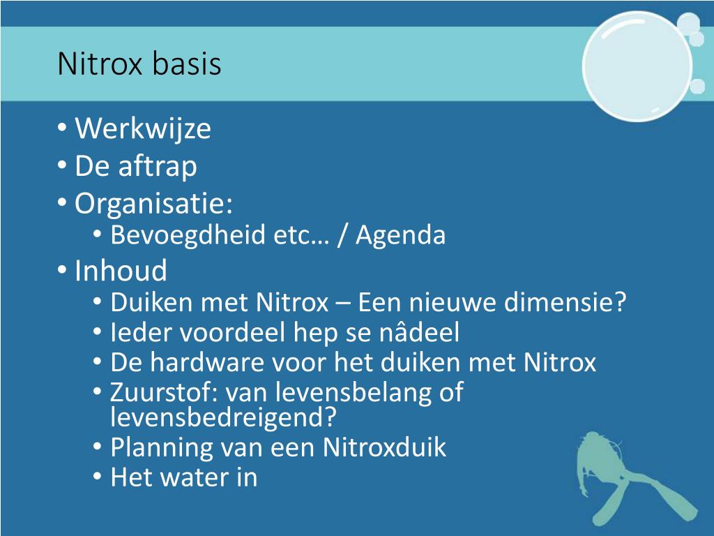 Nitrox basis • Werkwijze • De aftrap • Organisatie: • Bevoegdheid etc… / Agenda • Inhoud • Duiken met Nitrox – Een nieuwe dimensie? • Ieder voordeel hep se nâdeel • De hardware voor het duiken met Nitrox • Zuurstof: van levensbelang of levensbedreigend? • Planning van een Nitroxduik • Het water in