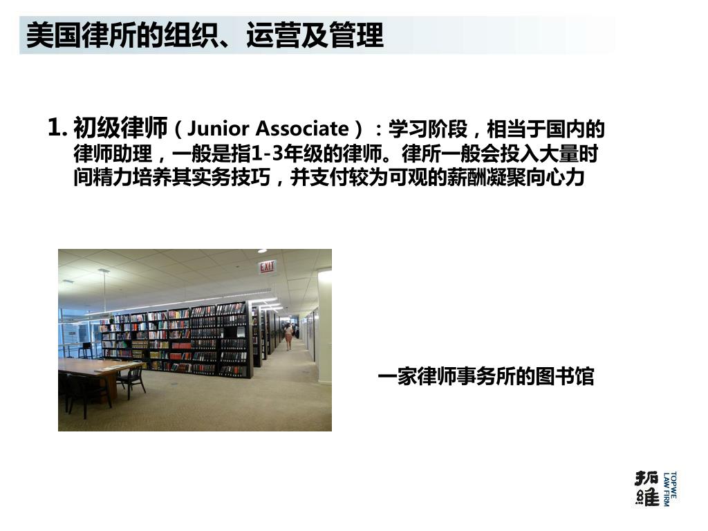 美国律所的组织、运营及管理 • 初级律师(Junior Associate):学习阶段,相当于国内的律师助理,一般是指1-3年级的律师。律所一般会投入大量时间精力培养其实务技巧,并支付较为可观的薪酬凝聚向心力 一家律师事务所的图书馆
