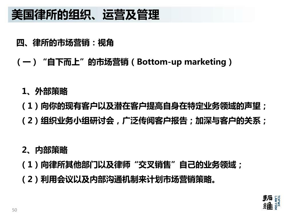 美国律所的组织、运营及管理 四、律所的市场营销:视角 (一)“自下而上”的市场营销(Bottom-up marketing) 1、外部策略 (1)向你的现有客户以及潜在客户提高自身在特定业务领域的声望; (2)组织业务小组研讨会,广泛传阅客户报告;加深与客户的关系; 2、内部策略 (1)向律所其他部门以及律师“交叉销售”自己的业务领域; (2)利用会议以及内部沟通机制来计划市场营销策略。