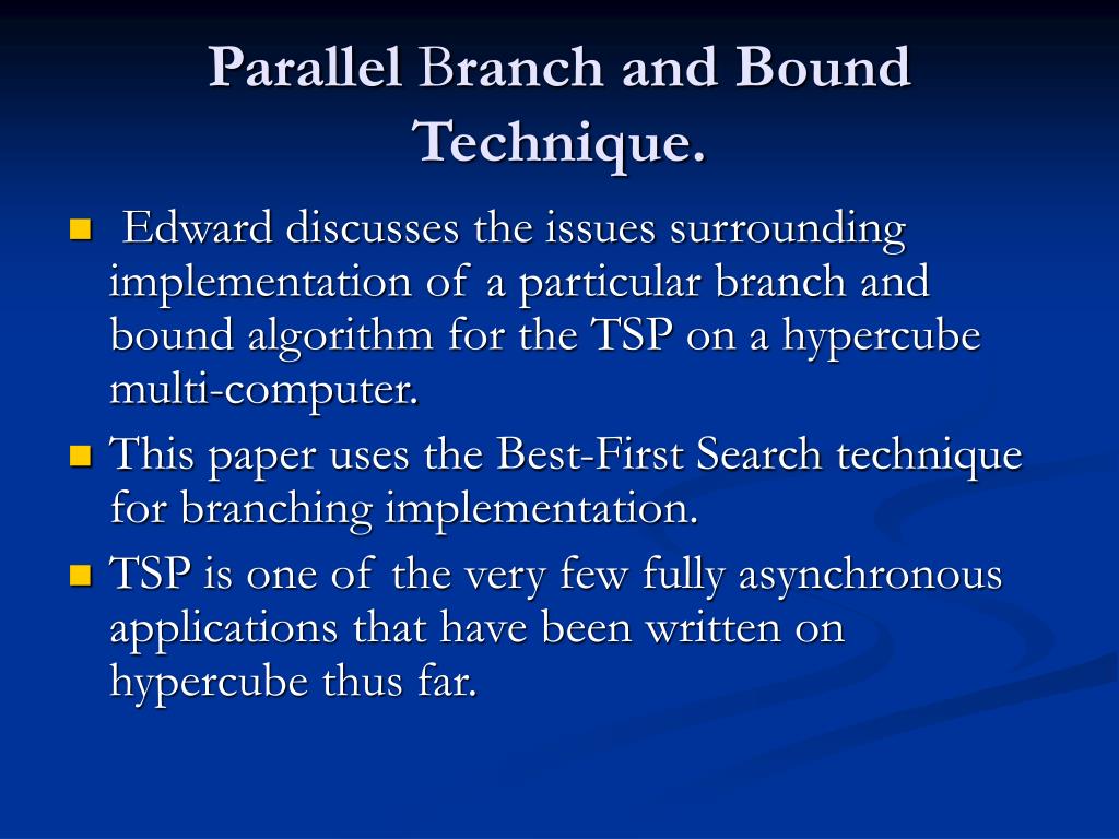 Parallel Branch and Bound Technique. • Edward discusses the issues surrounding implementation of a particular branch and bound algorithm for the TSP on a hypercube multi-computer. • This paper uses the Best-First Search technique for branching implementation. • TSP is one of the very few fully asynchronous applications that have been written on hypercube thus far.