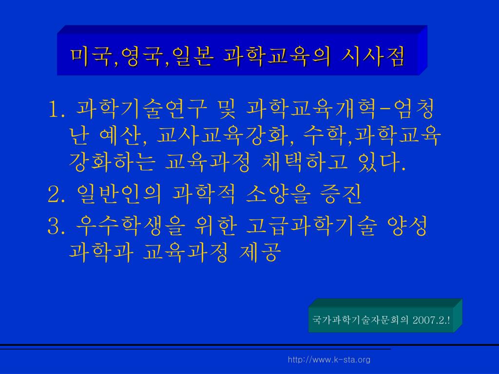 미국,영국,일본 과학교육의 시사점 • 과학기술연구 및 과학교육개혁-엄청난 예산, 교사교육강화, 수학,과학교육 강화하는 교육과정 채택하고 있다. • 일반인의 과학적 소양을 증진 • 우수학생을 위한 고급과학기술 양성 과학과 교육과정 제공 국가과학기술자문회의 2007.2.!
