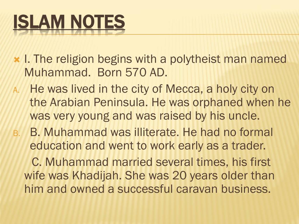 I. The religion begins with a polytheist man named Muhammad. Born 570 AD. • He was lived in the city of Mecca, a holy city on the Arabian Peninsula. He was orphaned when he was very young and was raised by his uncle. • B. Muhammad was illiterate. He had no formal education and went to work early as a trader. C. Muhammad married several times, his first wife was Khadijah. She was 20 years older than him and owned a successful caravan business. Islam Notes