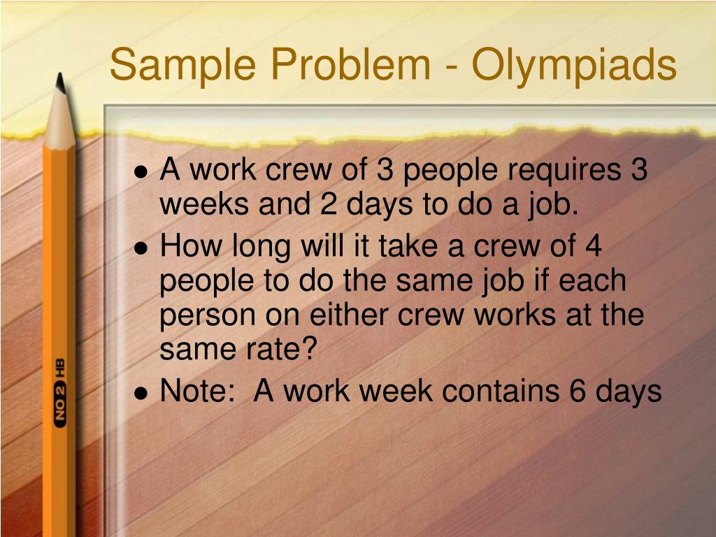 Sample Problem - Olympiads A work crew of 3 people requires 3 weeks and 2 days to do a job. How long will it take a crew of 4 people to do the same job if each person on either crew works at the same rate? Note: A work week contains 6 days