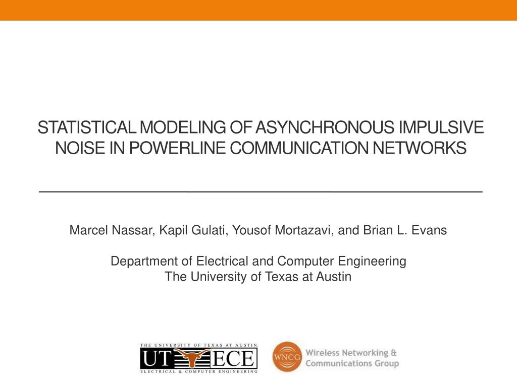 Statistical modeling of asynchronous impulsive noise in powerline communication networks Marcel Nassar, Kapil Gulati, Yousof Mortazavi, and Brian L. Evans Department of Electrical and Computer Engineering The University of Texas at Austin