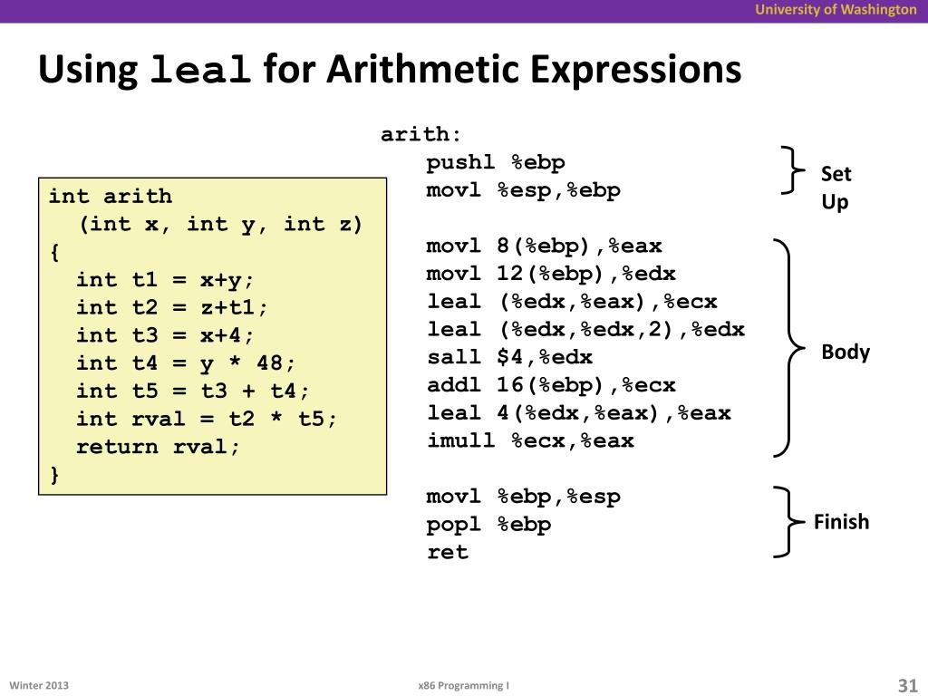 Using leal for Arithmetic Expressions arith: pushl %ebp movl %esp,%ebp movl 8(%ebp),%eax movl 12(%ebp),%edx leal (%edx,%eax),%ecx leal (%edx,%edx,2),%edx sall $4,%edx addl 16(%ebp),%ecx leal 4(%edx,%eax),%eax imull %ecx,%eax movl %ebp,%esp popl %ebp ret Set Up int arith (int x, int y, int z) { int t1 = x+y; int t2 = z+t1; int t3 = x+4; int t4 = y * 48; int t5 = t3 + t4; int rval = t2 * t5; return rval; } Body Finish x86 Programming I
