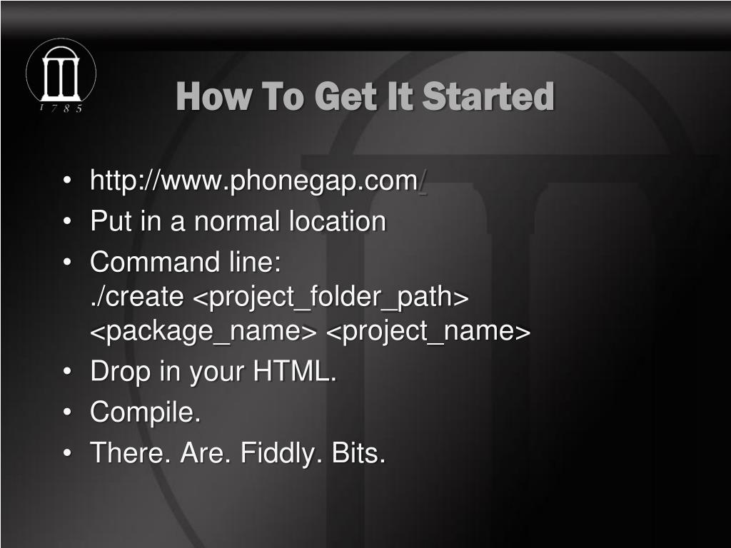How To Get It Started • http://www.phonegap.com/ • Put in a normal location • Command line:./create <project_folder_path> <package_name> <project_name> • Drop in your HTML. • Compile. • There. Are. Fiddly. Bits.