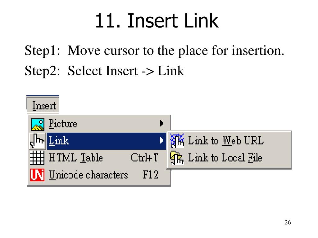 11. Insert Link Step1: Move cursor to the place for insertion. Step2: Select Insert -> Link