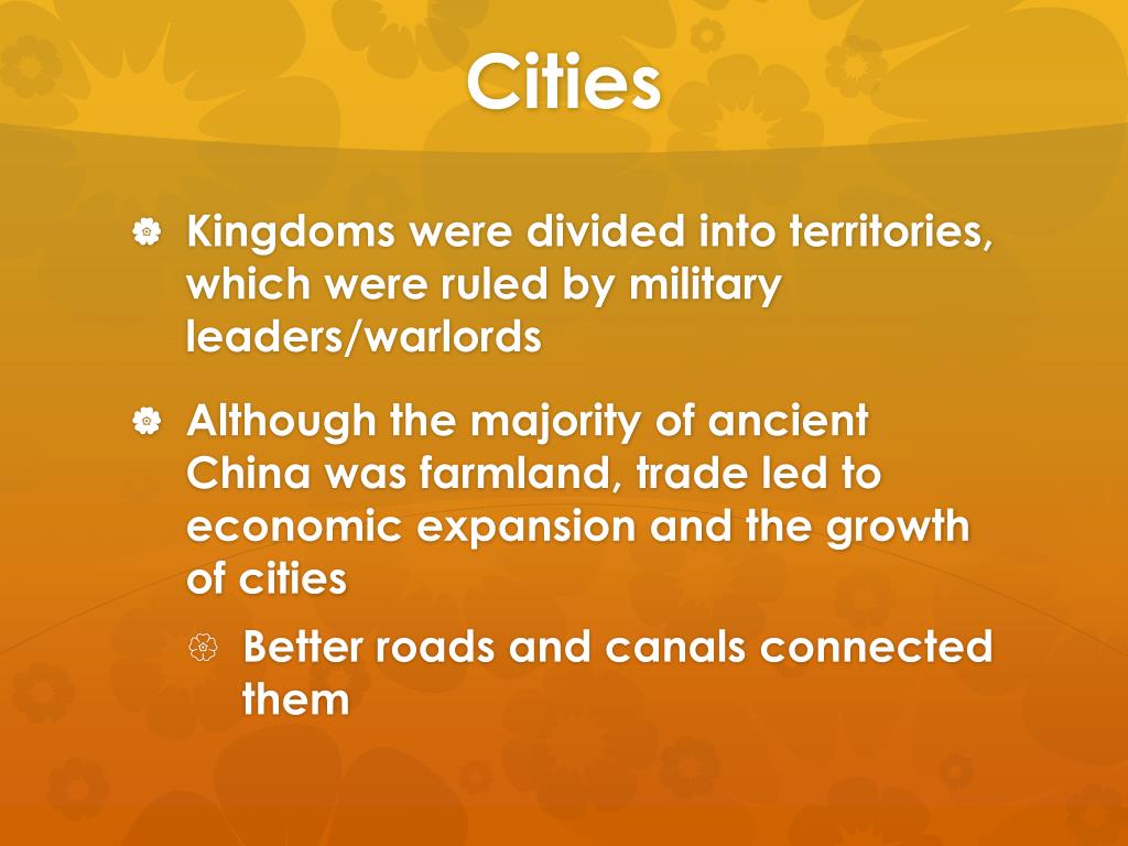 Cities • Kingdoms were divided into territories, which were ruled by military leaders/warlords • Although the majority of ancient China was farmland, trade led to economic expansion and the growth of cities • Better roads and canals connected them