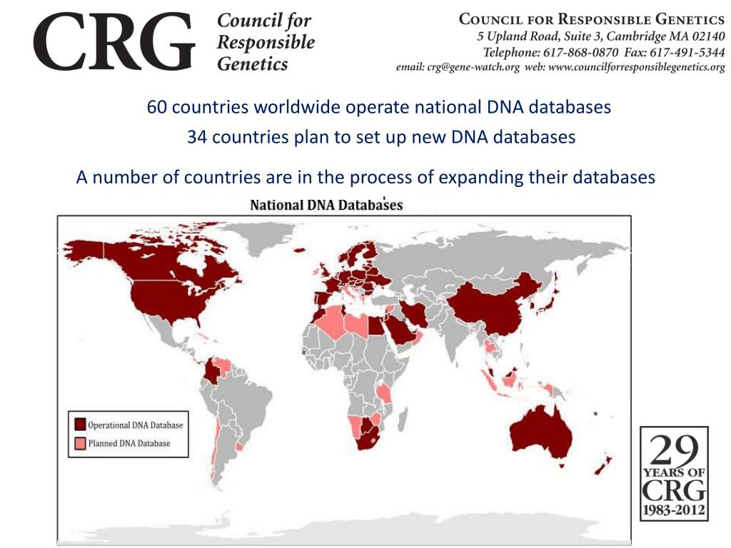 60 countries worldwide operate national DNA databases 34 countries plan to set up new DNA databases A number of countries are in the process of expanding their databases d