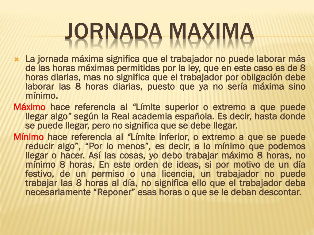 La jornada máxima significa que el trabajador no puede laborar más de las horas máximas permitidas por la ley, que en este caso es de 8 horas diarias, mas no significa que el trabajador por obligación debe laborar las 8 horas diarias, puesto que ya no sería máxima sino mínimo. Máximo hace referencia al “Límite superior o extremo a que puede llegar algo” según la Real academia española. Es decir, hasta donde se puede llegar, pero no significa que se debe llegar. Mínimo hace referencia al “Límite inferior, o extremo a que se puede reducir algo”, “Por lo menos”, es decir, a lo mínimo que podemos llegar o hacer. Así las cosas, yo debo trabajar máximo 8 horas, no mínimo 8 horas. En este orden de ideas, si por motivo de un día festivo, de un permiso o una licencia, un trabajador no puede trabajar las 8 horas al día, no significa ello que el trabajador deba necesariamente “Reponer” esas horas o que se le deban descontar. JORNADA MAXIMA