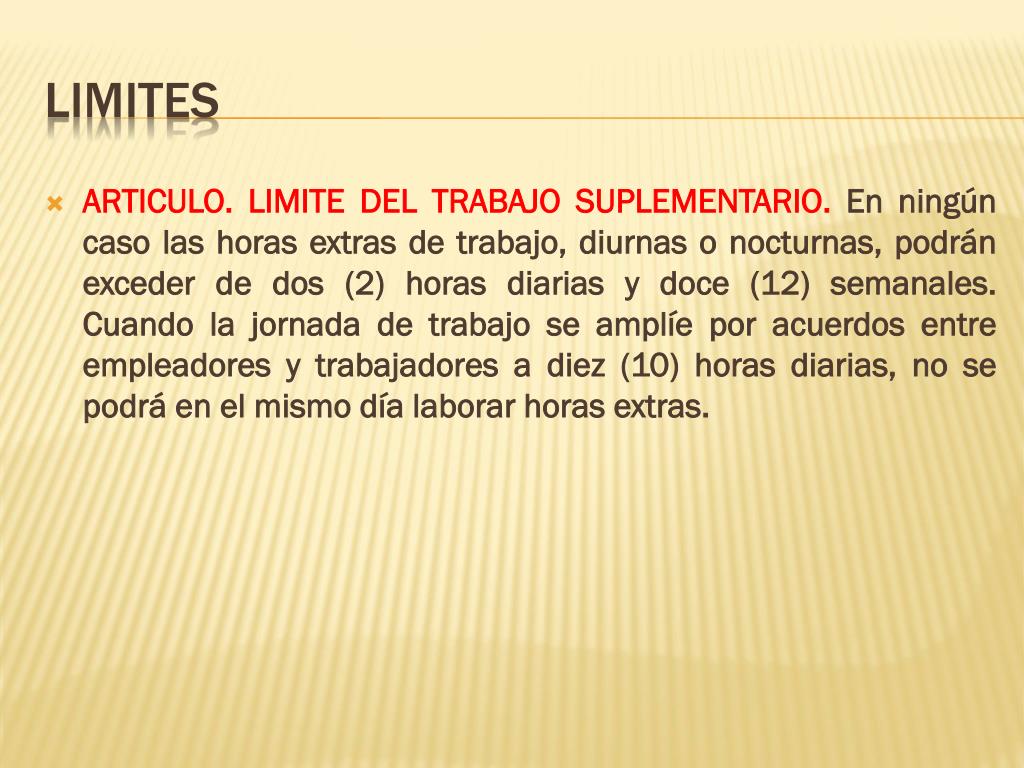 ARTICULO. LIMITE DEL TRABAJO SUPLEMENTARIO. En ningún caso las horas extras de trabajo, diurnas o nocturnas, podrán exceder de dos (2) horas diarias y doce (12) semanales. Cuando la jornada de trabajo se amplíe por acuerdos entre empleadores y trabajadores a diez (10) horas diarias, no se podrá en el mismo día laborar horas extras. LIMITES