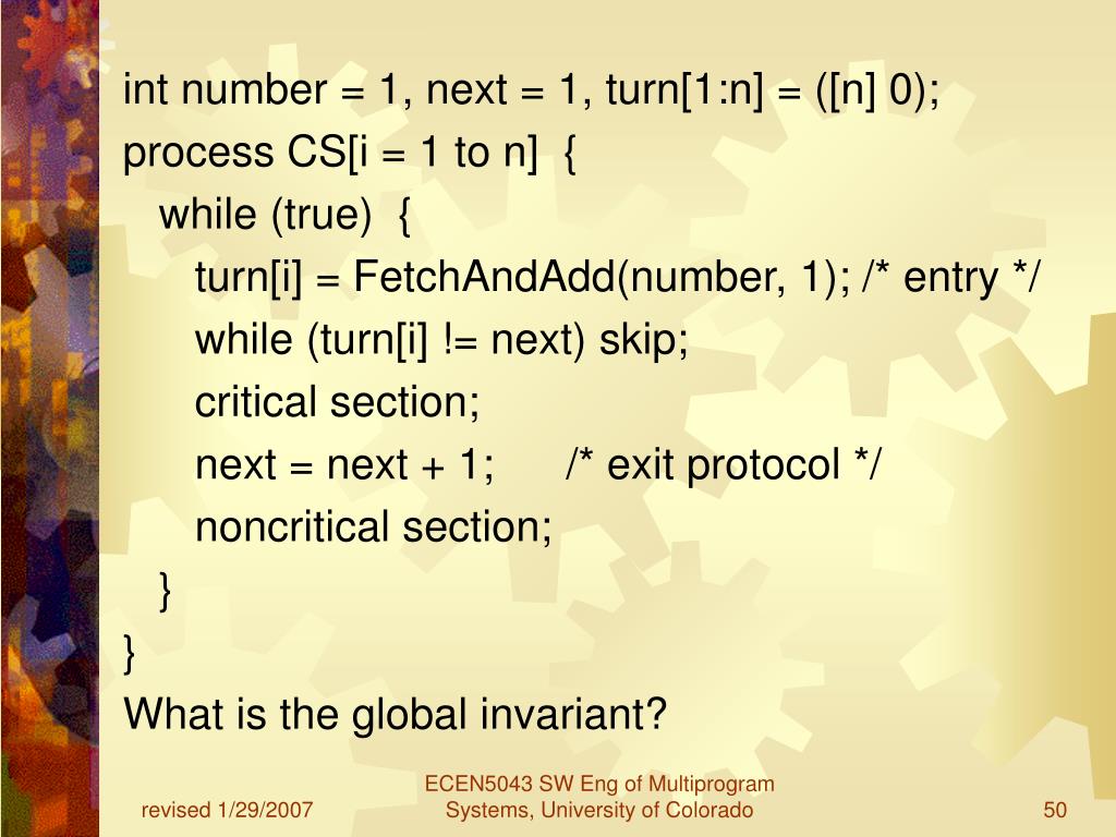 int number = 1, next = 1, turn[1:n] = ([n] 0); process CS[i = 1 to n] { while (true) { turn[i] = FetchAndAdd(number, 1); /* entry */ while (turn[i] != next) skip; critical section; next = next + 1; /* exit protocol */ noncritical section; } } What is the global invariant? ECEN5043 SW Eng of Multiprogram Systems, University of Colorado
