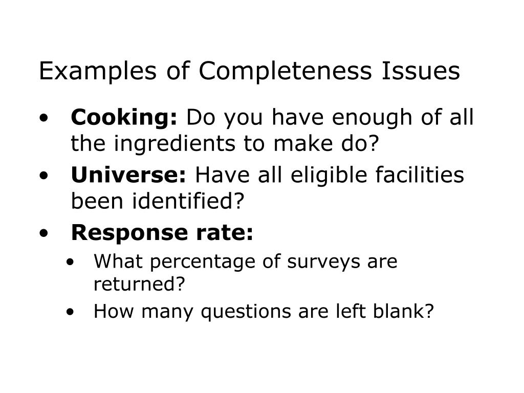 Examples of Completeness Issues • Cooking: Do you have enough of all the ingredients to make do? • Universe: Have all eligible facilities been identified? • Response rate: • What percentage of surveys are returned? • How many questions are left blank?
