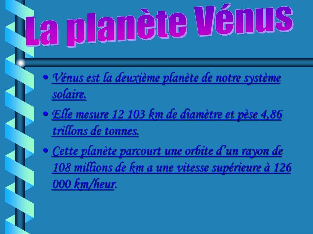 La planète Vénus. La planète Vénus. Vénus est la deuxième planète de notre système solaire. Elle mesure 12 103 km de diamètre et pèse 4,86 trillons de tonnes. Cette planète parcourt une orbite d’un rayon de 108 millions de km a une vitesse supérieure à 126 000 km/heur. La planète Vénus.