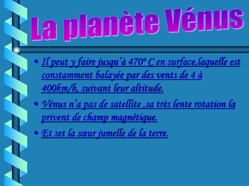 La planète Vénus • Il peut y faire jusqu’à 470º C en surface,laquelle est constamment balayée par des vents de 4 à 400km/h, suivant leur altitude. • Vénus n’a pas de satellite ,sa très lente rotation la privent de champ magnétique. • Et set la sœur jumelle de la terre.