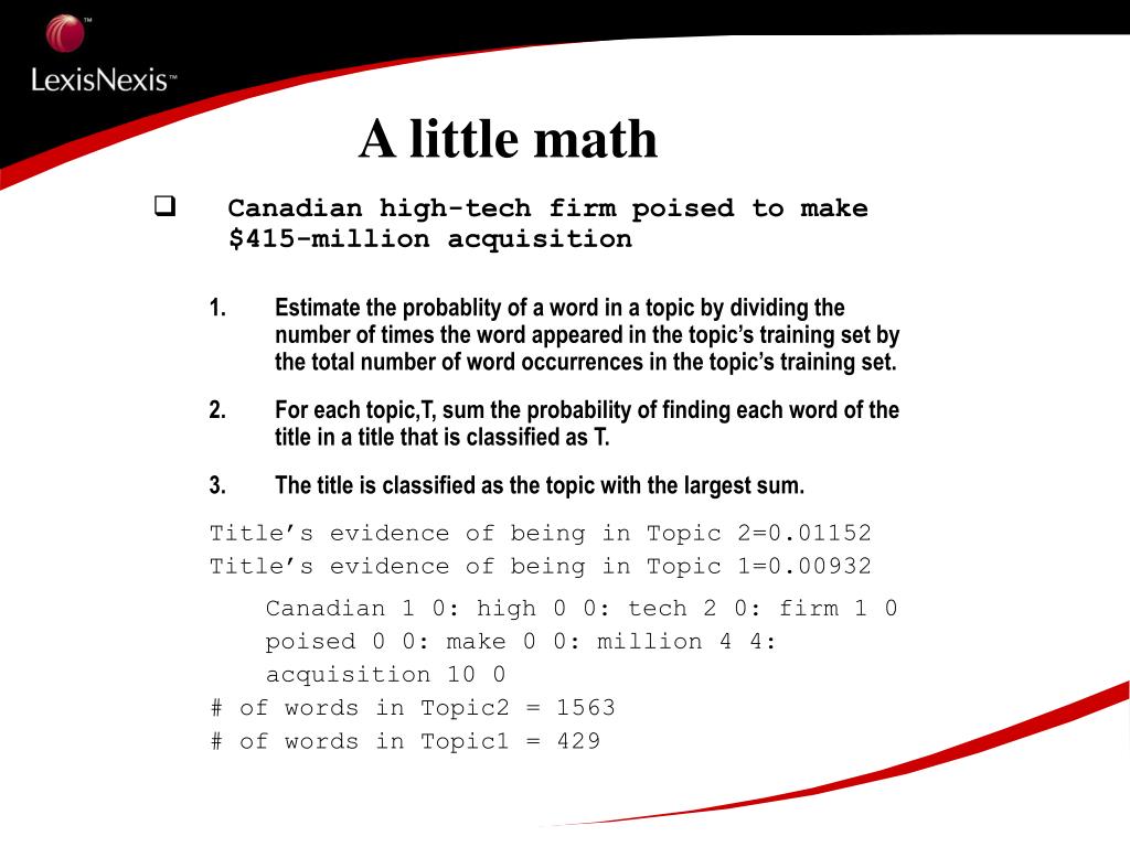 A little math • Canadian high-tech firm poised to make $415-millionacquisition • Estimate the probablity of a word in a topic by dividing the number of times the word appeared in the topic’s training set by the total number of word occurrences in the topic’s training set. • For each topic,T, sum the probability of finding each word of the title in a title that is classified as T. • The title is classified as the topic with the largest sum. Title’s evidence of being in Topic 2=0.01152 Title’s evidence of being in Topic 1=0.00932 Canadian 1 0: high 0 0: tech 2 0: firm 1 0 poised 0 0: make 0 0: million 4 4: acquisition 10 0 # of words in Topic2 = 1563 # of words in Topic1 = 429
