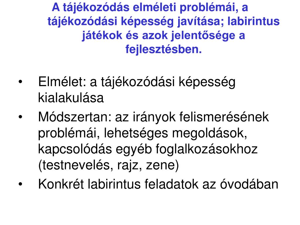 A tájékozódás elméleti problémái, a tájékozódási képesség javítása; labirintus játékok és azok jelentősége a fejlesztésben. • Elmélet: a tájékozódási képesség kialakulása • Módszertan: az irányok felismerésének problémái, lehetséges megoldások, kapcsolódás egyéb foglalkozásokhoz (testnevelés, rajz, zene) • Konkrét labirintus feladatok az óvodában