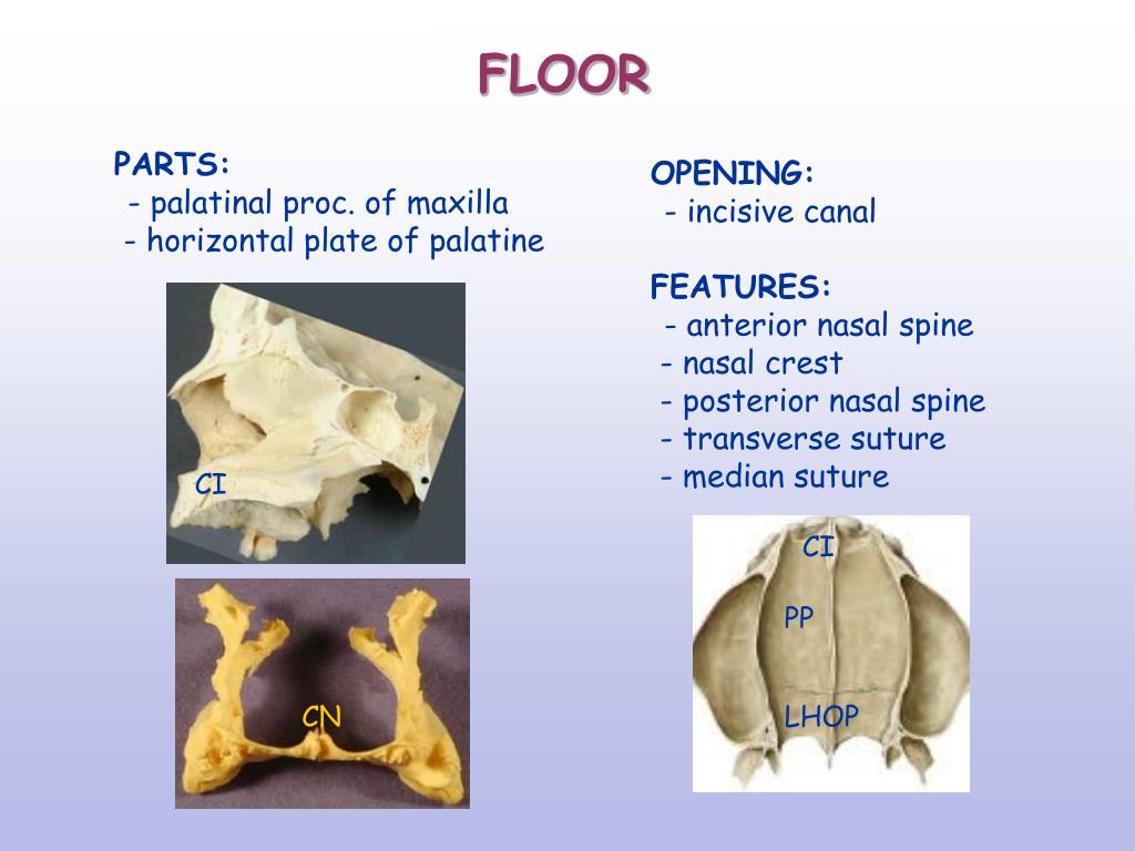 FLOOR PARTS: - palatinal proc. of maxilla - horizontal plate of palatine OPENING: - incisive canal FEATURES: - anterior nasal spine - nasal crest - posterior nasal spine - transverse suture - median suture CI CI PP CN LHOP