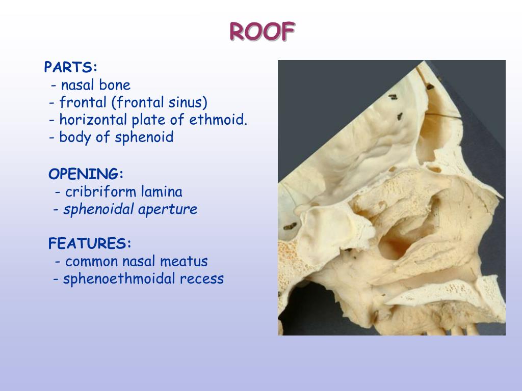 ROOF PARTS: - nasal bone - frontal (frontal sinus) - horizontal plate of ethmoid. - body of sphenoid OPENING: - cribriform lamina - sphenoidalaperture FEATURES: - common nasal meatus - sphenoethmoidal recess