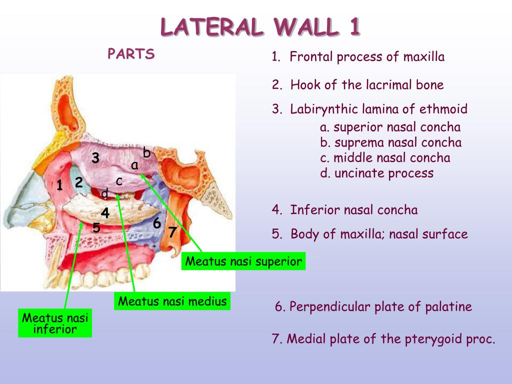 THE LATERAL WALL Processus pterygoideus ossis sphenoidalis Lamina perpendicularis ossis palatinalis Labyrinthus ethmoidalis (+bulla ethmoidalis+processus uncinatus) Corpus maxillae Concha nasalis inferior Os lacrimale Os frontale Processus frontalis maxillae Os nasale