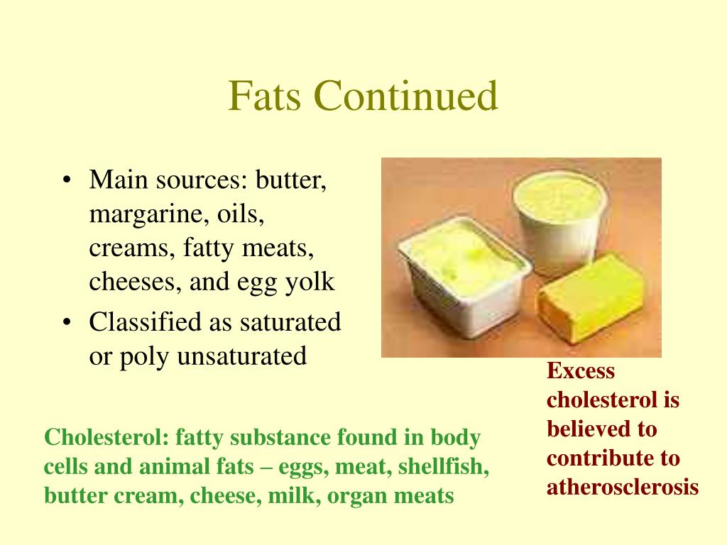 Fats Continued • Main sources: butter, margarine, oils, creams, fatty meats, cheeses, and egg yolk • Classified as saturated or poly unsaturated Excess cholesterol is believed to contribute to atherosclerosis Cholesterol: fatty substance found in body cells and animal fats – eggs, meat, shellfish, butter cream, cheese, milk, organ meats