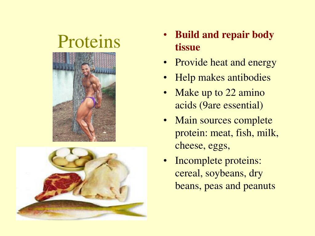 Proteins • Build and repair body tissue • Provide heat and energy • Help makes antibodies • Make up to 22 amino acids (9are essential) • Main sources complete protein: meat, fish, milk, cheese, eggs, • Incomplete proteins: cereal, soybeans, dry beans, peas and peanuts