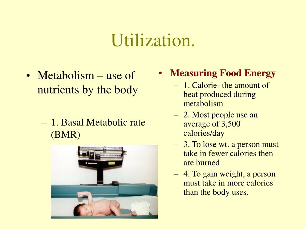 Metabolism – use of nutrients by the body 1. Basal Metabolic rate (BMR) Measuring Food Energy 1. Calorie- the amount of heat produced during metabolism 2. Most people use an average of 3,500 calories/day 3. To lose wt. a person must take in fewer calories then are burned 4. To gain weight, a person must take in more calories than the body uses. Utilization.