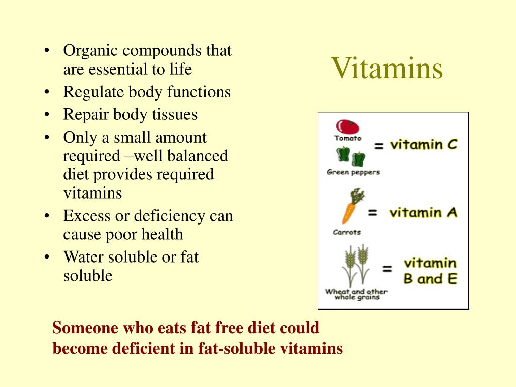Vitamins • Organic compounds that are essential to life • Regulate body functions • Repair body tissues • Only a small amount required –well balanced diet provides required vitamins • Excess or deficiency can cause poor health • Water soluble or fat soluble Someone who eats fat free diet could become deficient in fat-soluble vitamins