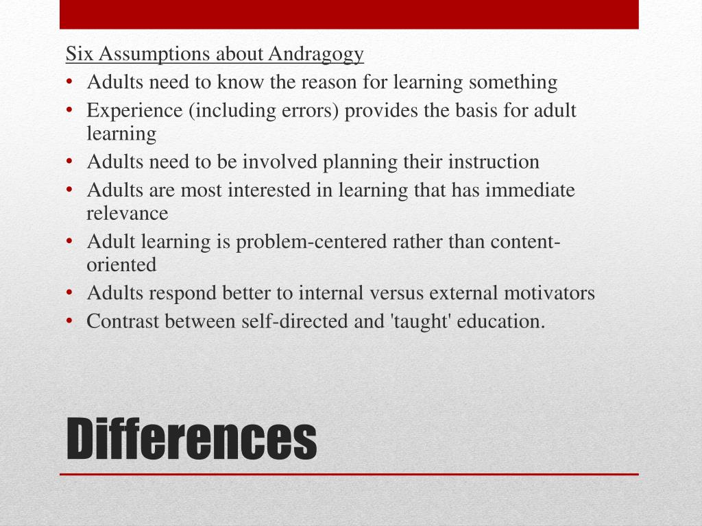Six Assumptions about Andragogy • Adults need to know the reason for learning something • Experience (including errors) provides the basis for adult learning • Adults need to be involved planning their instruction • Adults are most interested in learning that has immediate relevance • Adult learning is problem-centered rather than content-oriented • Adults respond better to internal versus external motivators • Contrast between self-directed and 'taught' education. Differences
