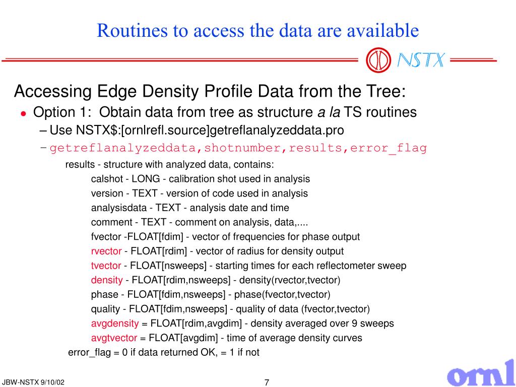 Routines to access the data are available • Accessing Edge Density Profile Data from the Tree: • Option 1: Obtain data from tree as structure a la TS routines • Use NSTX$:[ornlrefl.source]getreflanalyzeddata.pro • getreflanalyzeddata,shotnumber,results,error_flag • results - structure with analyzed data, contains: • calshot - LONG - calibration shot used in analysis • version - TEXT - version of code used in analysis • analysisdata - TEXT - analysis date and time • comment - TEXT - comment on analysis, data,.... • fvector -FLOAT[fdim] - vector of frequencies for phase output • rvector - FLOAT[rdim] - vector of radius for density output • tvector - FLOAT[nsweeps] - starting times for each reflectometer sweep • density - FLOAT[rdim,nsweeps] - density(rvector,tvector) • phase - FLOAT[fdim,nsweeps] - phase(fvector,tvector) • quality - FLOAT[fdim,nsweeps] - quality of data (fvector,tvector) • avgdensity = FLOAT[rdim,avgdim] - density averaged over 9 sweeps • avgtvector = FLOAT[avgdim] - time of average density curves • error_flag = 0 if data returned OK, = 1 if not