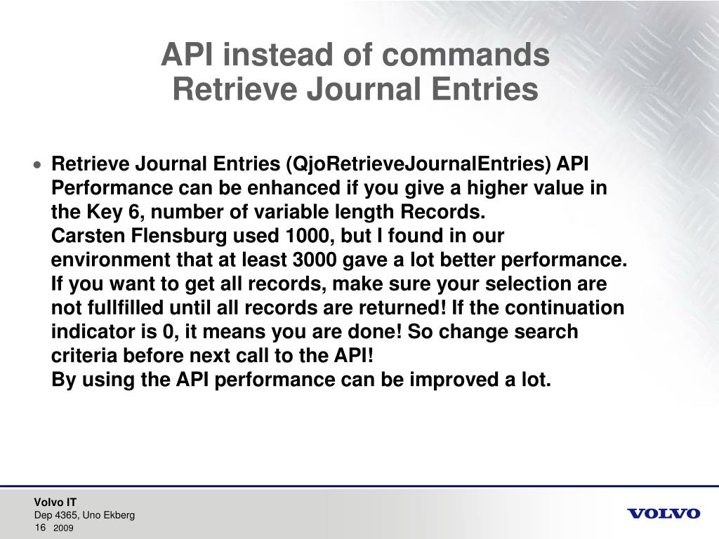 API instead of commandsRetrieve Journal Entries • Retrieve Journal Entries (QjoRetrieveJournalEntries) APIPerformance can be enhanced if you give a higher value in the Key 6, number of variable length Records. Carsten Flensburg used 1000, but I found in our environment that at least 3000 gave a lot better performance. If you want to get all records, make sure your selection are not fullfilled until all records are returned! If the continuation indicator is 0, it means you are done! So change search criteria before next call to the API!By using the API performance can be improved a lot. Dep 4365, Uno Ekberg
