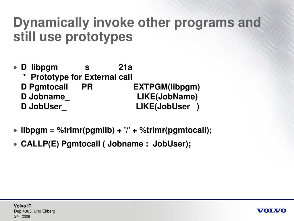 Dynamically invoke other programs and still use prototypes • D libpgm s 21a * Prototype for External call D Pgmtocall PR EXTPGM(libpgm) D Jobname_ LIKE(JobName) D JobUser_ LIKE(JobUser ) • libpgm = %trimr(pgmlib) + '/' + %trimr(pgmtocall); • CALLP(E) Pgmtocall ( Jobname : JobUser); Dep 4365, Uno Ekberg