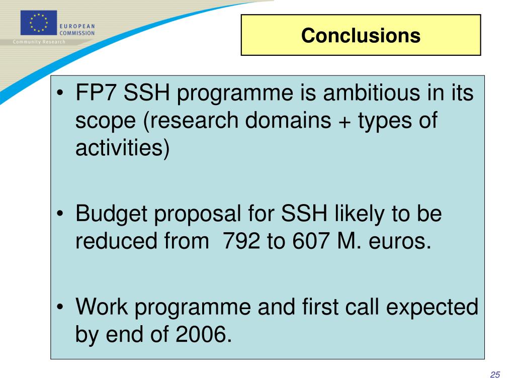Conclusions • FP7 SSH programme is ambitious in its scope (research domains + types of activities) • Budget proposal for SSH likely to be reduced from 792 to 607 M. euros. • Work programme and first call expected by end of 2006. 25