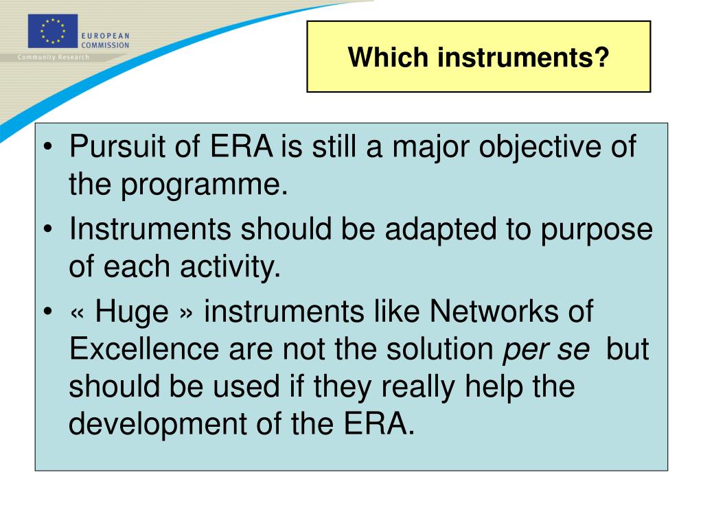 Which instruments? • Pursuit of ERA is still a major objective of the programme. • Instruments should be adapted to purpose of each activity. • « Huge » instruments like Networks of Excellence are not the solution per se but should be used if they really help the development of the ERA.