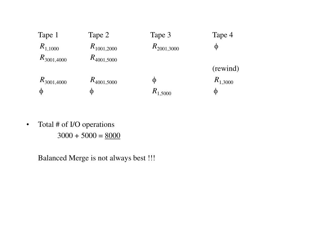 Tape 1 Tape 2 Tape 3 Tape 4 R1,1000R1001,2000R2001,3000 R3001,4000R4001,5000 (rewind) R3001,4000R4001,5000 R1,3000 R1,5000 • Total # of I/O operations 3000 + 5000 = 8000 Balanced Merge is not always best !!!