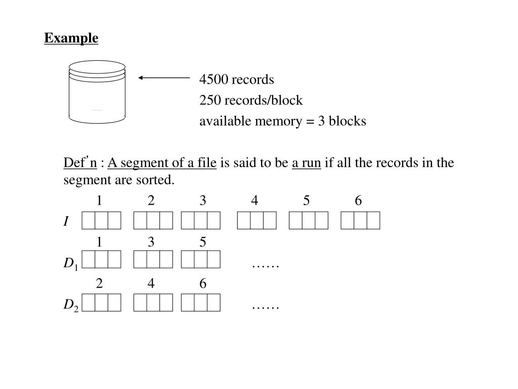 Example 4500 records 250 records/block available memory = 3 blocks Def’n : A segment of a file is said to be a run if all the records in the segment are sorted. 1 2 3 4 5 6 I 1 3 5 D1 …… 2 4 6 D2 ……