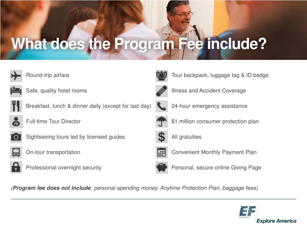 Round-trip airfare Safe, quality hotel rooms Breakfast, lunch & dinner daily (except for last day) Full-time Tour Director Sightseeing tours led by licensed guides On-tour transportation Professional overnight security What does the Program Fee include? Tour backpack, luggage tag & ID badge Illness and Accident Coverage 24-hour emergency assistance $1 million consumer protection plan All gratuities Convenient Monthly Payment Plan Personal, secure online Giving Page (Program fee does not include: personal spending money, Anytime Protection Plan, baggage fees)