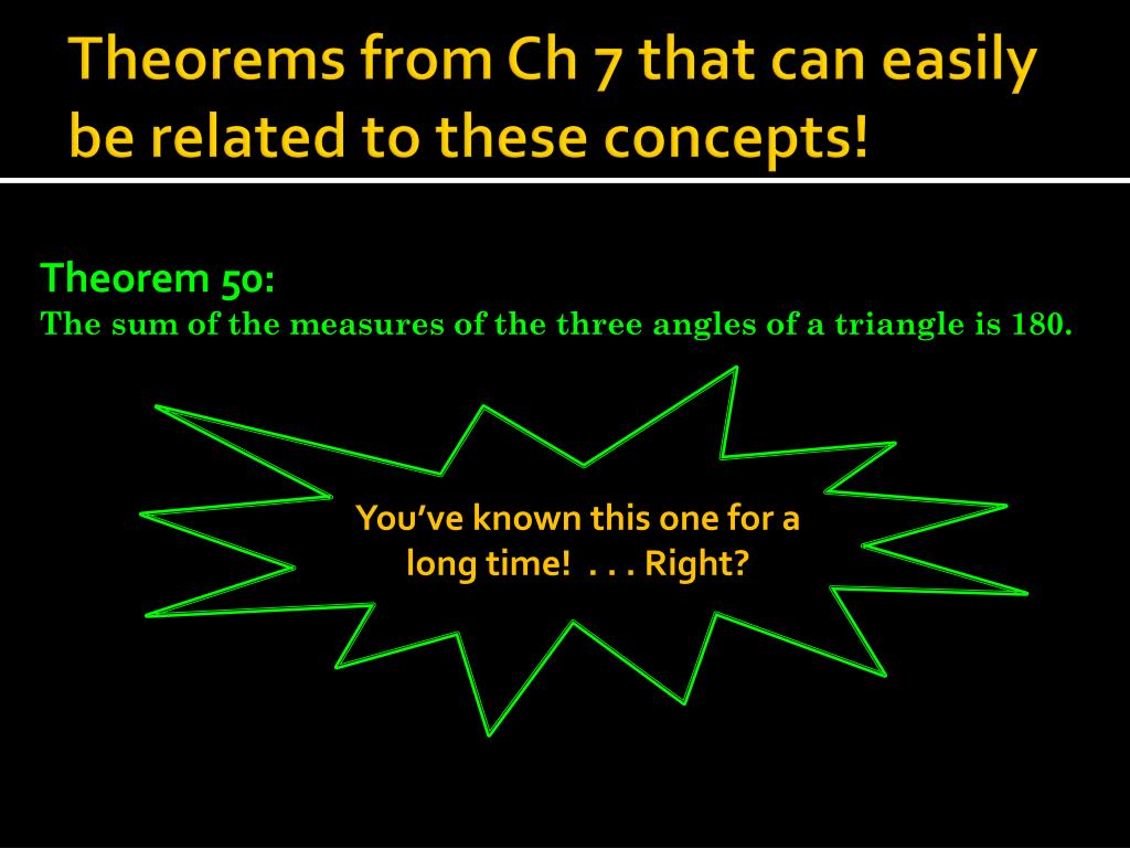 Theorems from Ch 7 that can easily be related to these concepts! Theorem 50: The sum of the measures of the three angles of a triangle is 180. You’ve known this one for a long time! . . . Right?