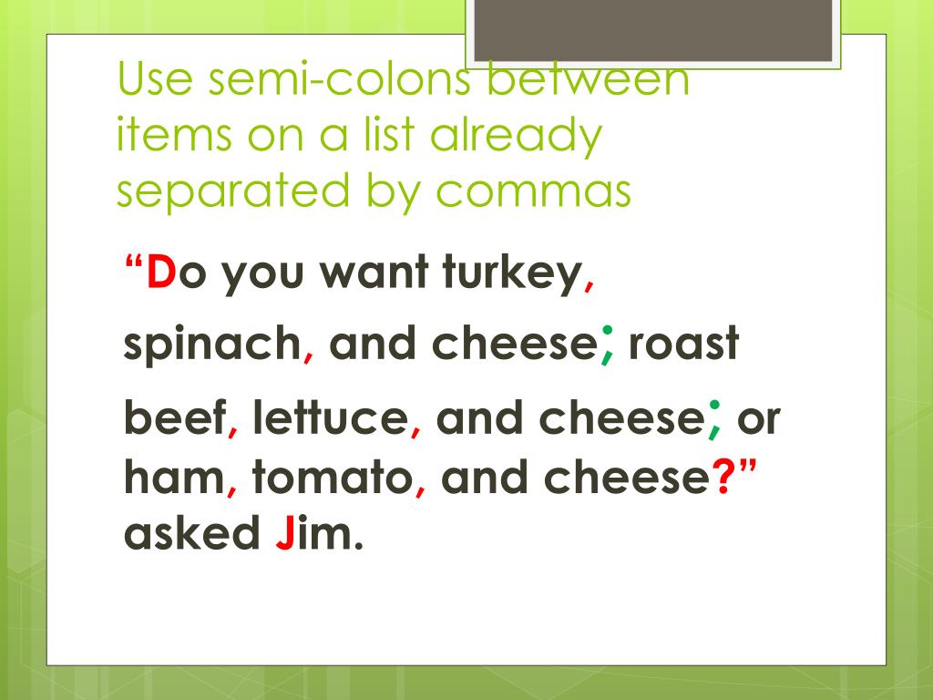 Use semi-colons between items on a list already separated by commas “Do you want turkey, spinach,and cheese;roast beef, lettuce,and cheese;or ham,tomato, and cheese?”asked Jim.