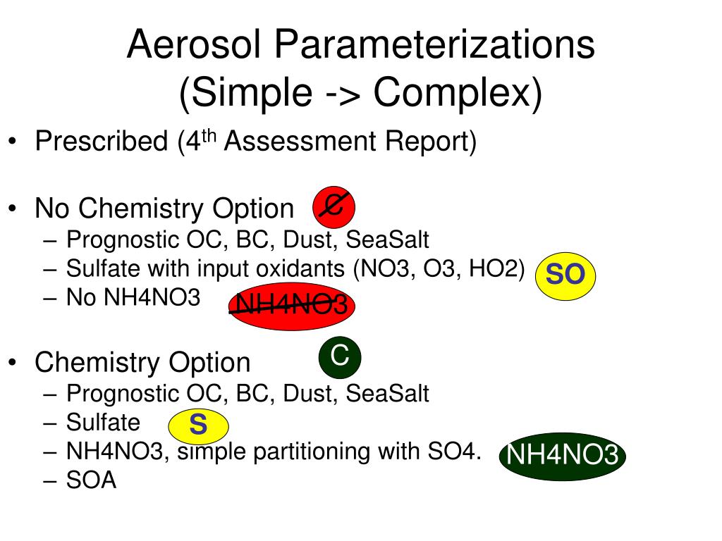 Prescribed (4th Assessment Report) No Chemistry Option Prognostic OC, BC, Dust, SeaSalt Sulfate with input oxidants (NO3, O3, HO2) No NH4NO3 Chemistry Option Prognostic OC, BC, Dust, SeaSalt Sulfate NH4NO3, simple partitioning with SO4. SOA Aerosol Parameterizations(Simple -> Complex) C SO NH4NO3 C S NH4NO3