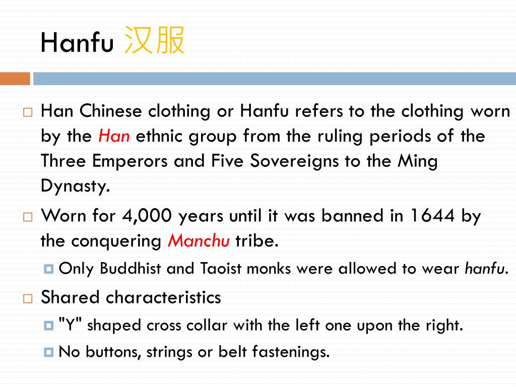 TRADITIONAL Chinese Clothing. Hanfu 汉服. Han Chinese clothing or Hanfu refers to the clothing worn by the Han ethnic group from the ruling periods of the Three Emperors and Five Sovereigns to the Ming Dynasty. Worn for 4,000 years until it was banned in 1644 by the conquering Manchu tribe.