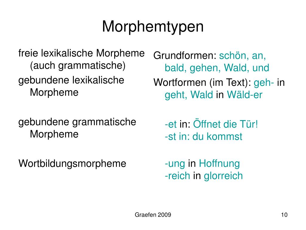 freie lexikalische Morpheme(auch grammatische) gebundene lexikalische Morpheme gebundene grammatische Morpheme Wortbildungsmorpheme Grundformen: schön, an, bald, gehen, Wald, und Wortformen (im Text): geh- in geht, Wald in Wäld-er -et in: Öffnet die Tür!-st in: du kommst -ung in Hoffnung-reich in glorreich Morphemtypen Graefen 2009