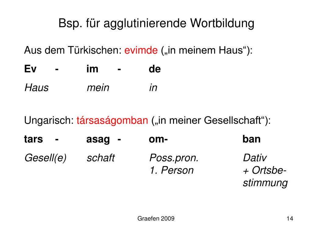 Bsp. für agglutinierende Wortbildung Aus dem Türkischen: evimde („in meinem Haus“): Ev - im - de Haus mein in Ungarisch: társaságomban („in meiner Gesellschaft“): tars - asag - om- ban Gesell(e) schaft Poss.pron. Dativ 1. Person + Ortsbe- stimmung Graefen 2009