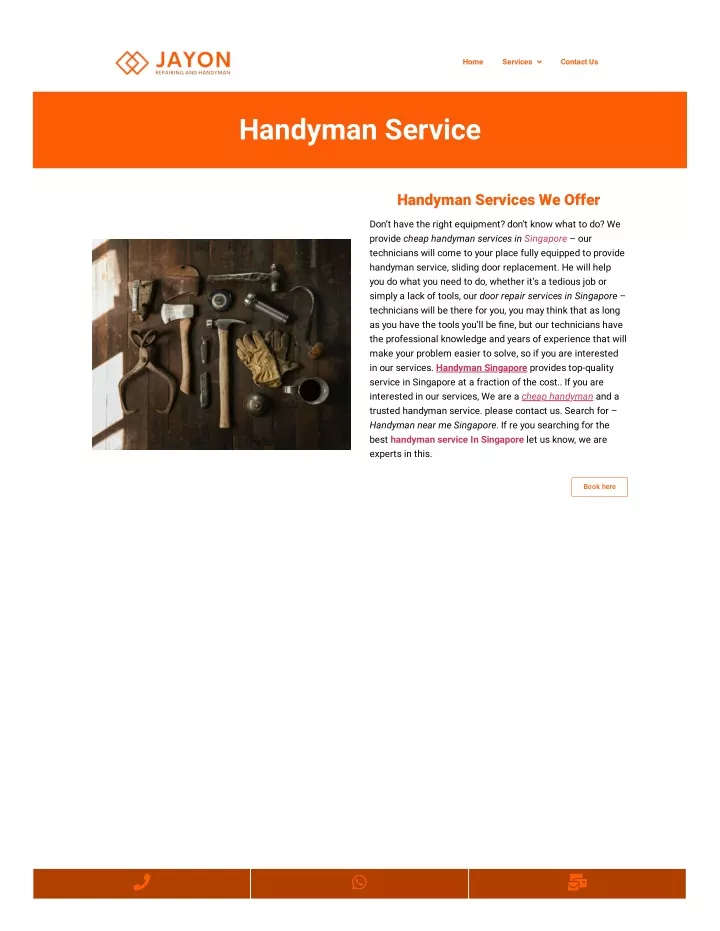Home Services Contact Us Handyman Service Handyman Services We Offer Don’t have the right equipment? don’t know what to do? We provide cheap handyman services in Singapore – our technicians will come to your place fully equipped to provide handyman service, sliding door replacement. He will help you do what you need to do, whether it’s a tedious job or simply a lack of tools, our door repair services in Singapore – technicians will be there for you, you may think that as long as you have the tools you’ll be ?ne, but our technicians have the professional knowledge and years of experience that will make your problem easier to solve, so if you are interested in our services. Handyman Singapore provides top-quality service in Singapore at a fraction of the cost.. If you are interested in our services, We are a cheap handyman and a trusted handyman service. please contact us. Search for – Handyman near me Singapore. If re you searching for the best handyman service In Singapore let us know, we are experts in this. Book here