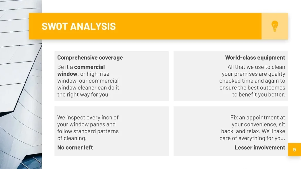 SWOT ANALYSIS Comprehensive coverage Be it a commercial window, or high-rise window, our commercial window cleaner can do it the right way for you. World-class equipment All that we use to clean your premises are quality checked time and again to ensure the best outcomes to benefit you better. We inspect every inch of your window panes and follow standard patterns of cleaning. No corner left Fix an appointment at your convenience, sit back, and relax. We’ll take care of everything for you. Lesser involvement 9